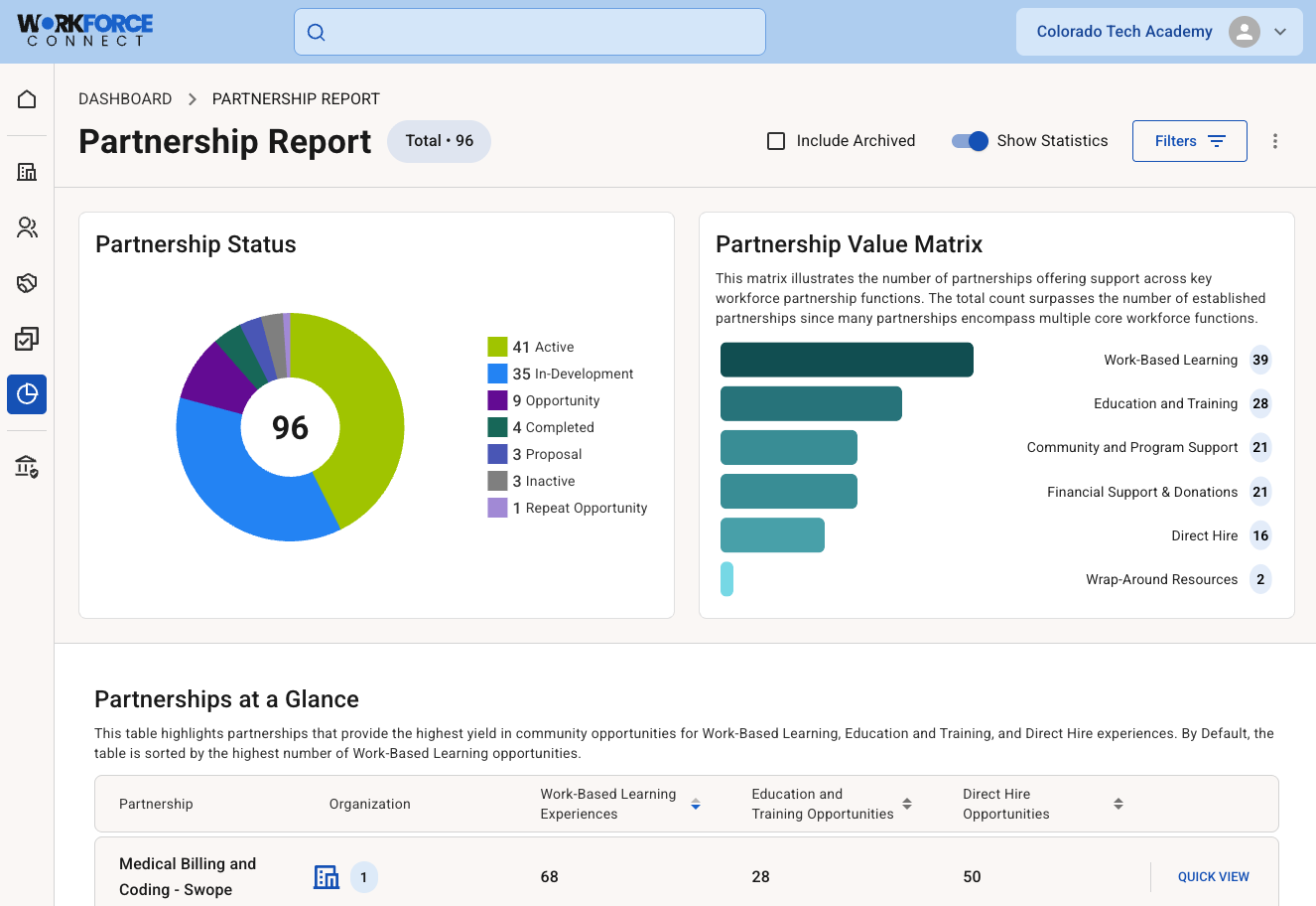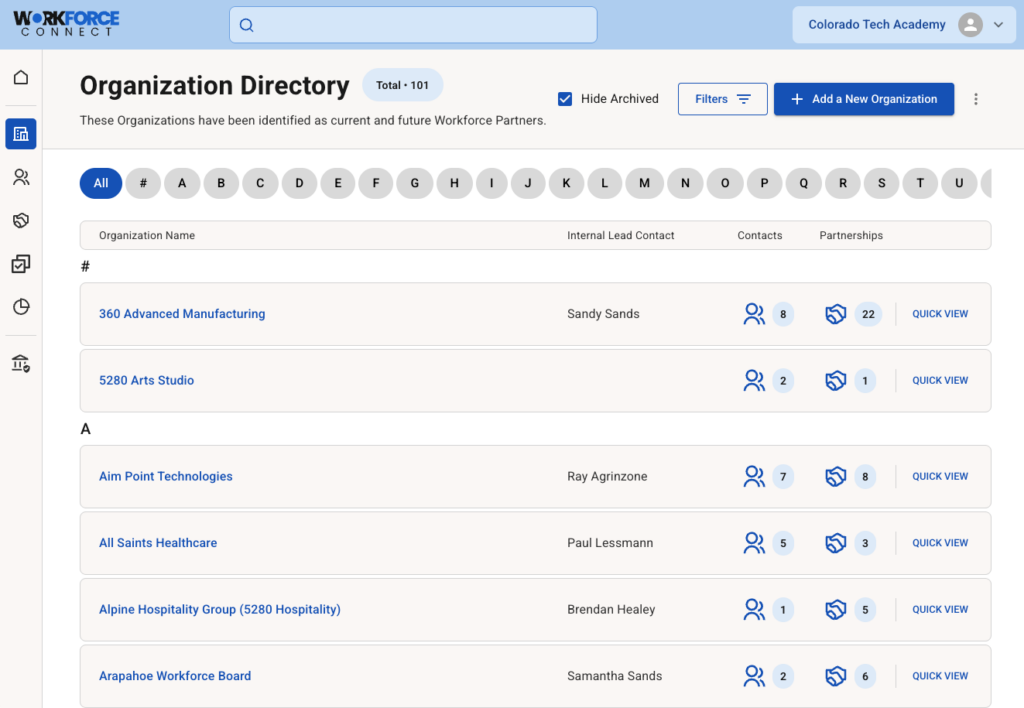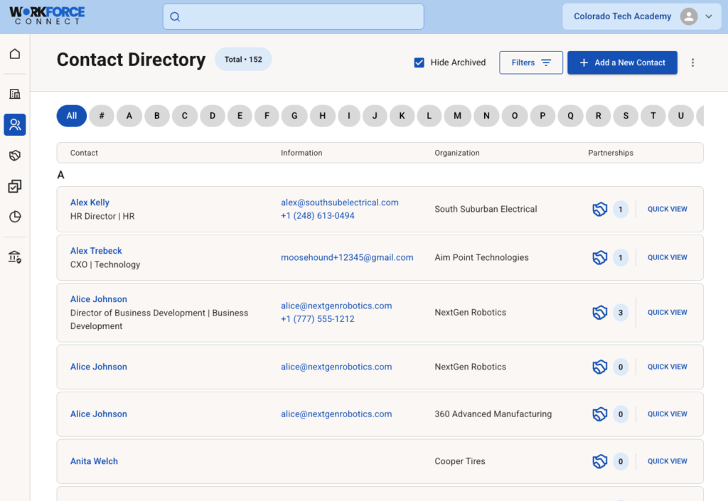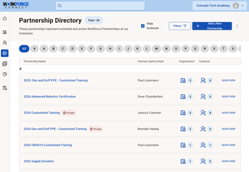 Workforce Connect is purpose-built to make partnership management simple, visible, and scalable across the institution—empowering leaders to make better decisions and maximize impact through ease of use, thoughtful design, and enterprise-level scalability.